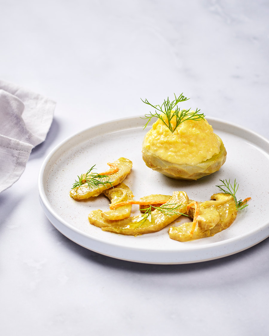 3. Cuire les fonds d’artichaut à feu doux dans un sautoir à couvert avec beurre, Cari Gosse, jus de citron, sel et poivre.